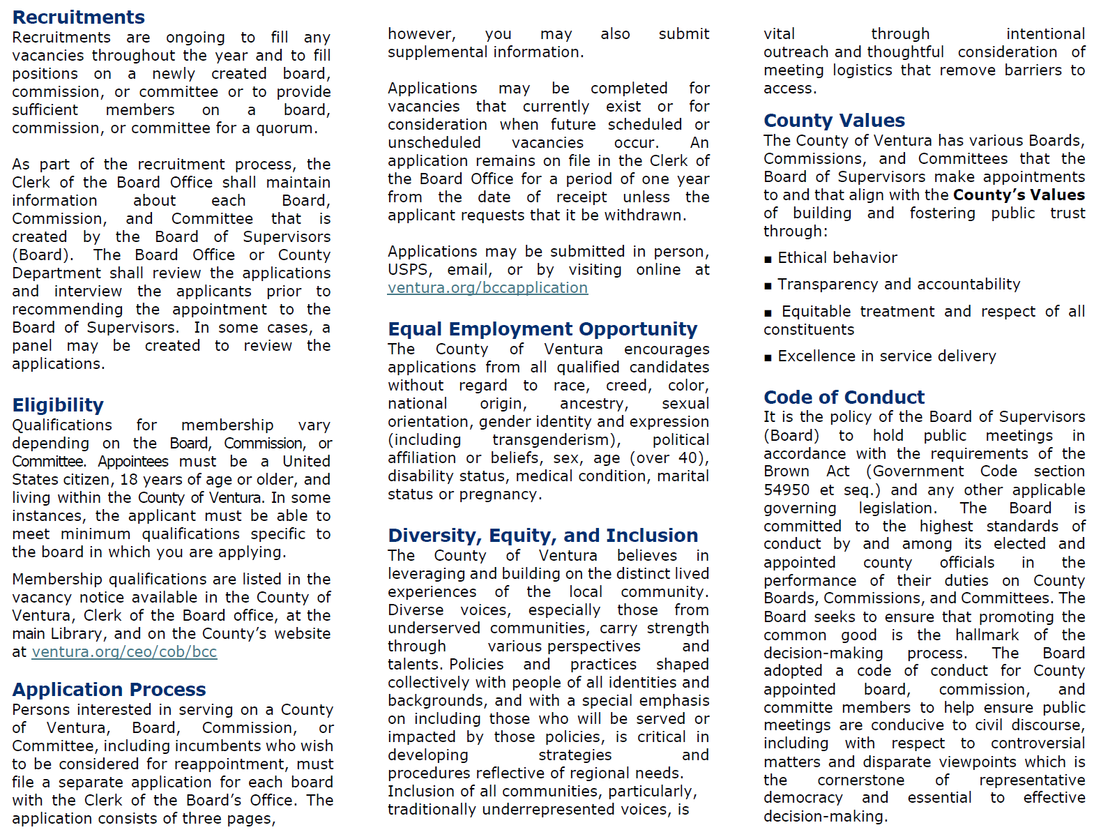 Select here to complete an electronic Application for Appointment to a Board/Commission/Committee. We recommend reviewing the positions listed on the "Current Vacancies" tab above to see which positions are currently available and then applying from that page. However, you may also apply to any of the County's Boards/Commissions/Committees by selecting this link, which will take you to the electronic application that can be completed online. If you are sharing this information with others, they may directly access the online application form by visiting www.venturacounty.gov/bccapplication