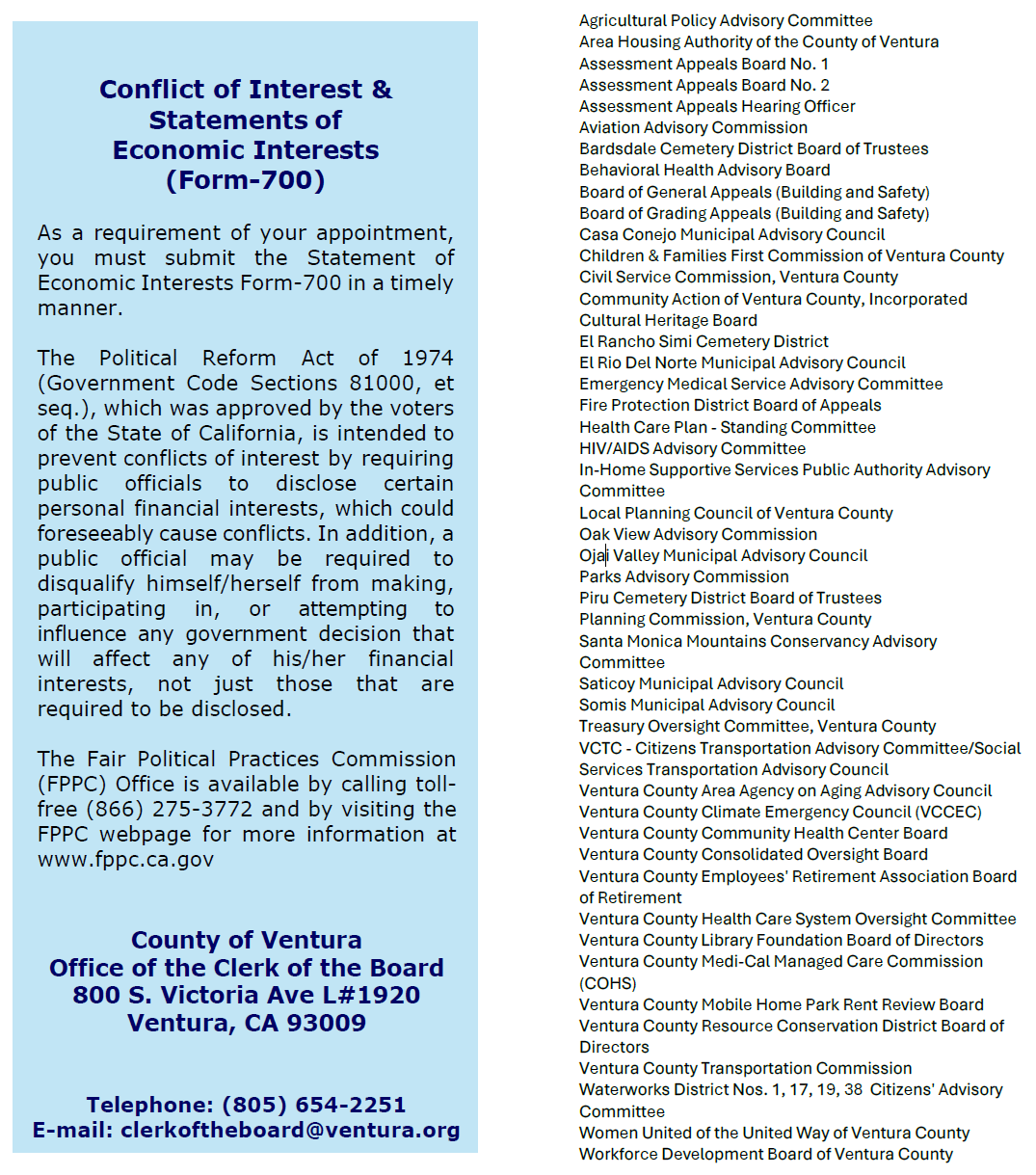 The County of Ventura Board of Supervisors make appointments to various Boards, Commissions, and Committees. Click on the name of each Board/Commission below to view more details. You may search for positions which are open to the public to apply for by applying the “Public Vacancy” filter.