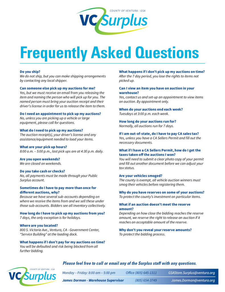 - A continuación se enumeran los artículos disponibles para la venta de excedentes mediante oferta sellada. Todas las partes interesadas deben responder como se indica en el listado de venta. Comuníquese con la Agencia de Servicios Generales del CONDADO DE VENTURA, Servicios de Adquisiciones (805) 654-3752 para obtener más información.