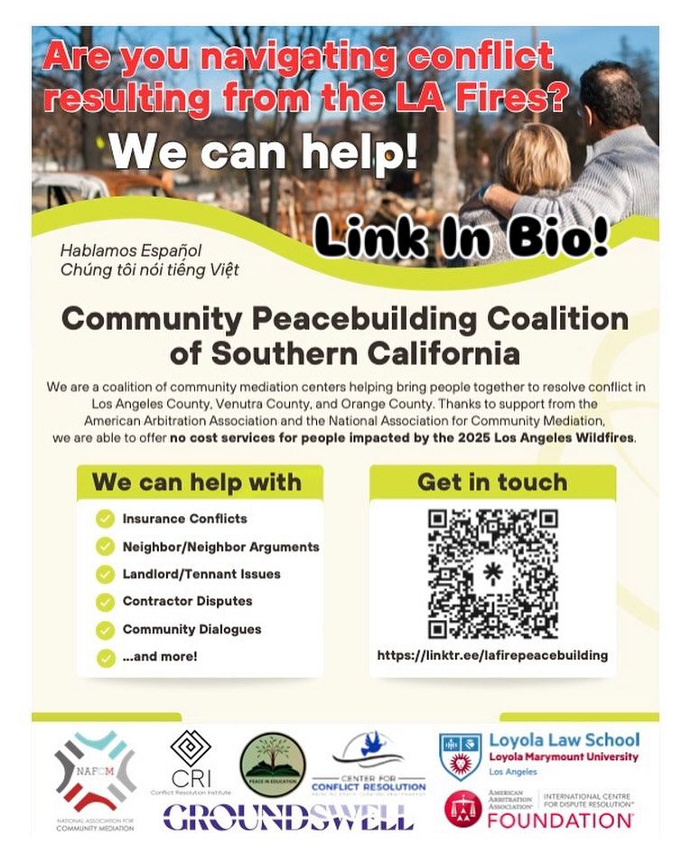 Conflict Resolution Institute (CRI) in Ventura has grant funds to provide FREE mediation services to the recent fire survivors in Ventura County, with services potentially covering housing disputes, insurance claims, employment issues, and interpersonal conflicts. For more information, call 805-384-1313 or email info@conflictresolutionvc.org.