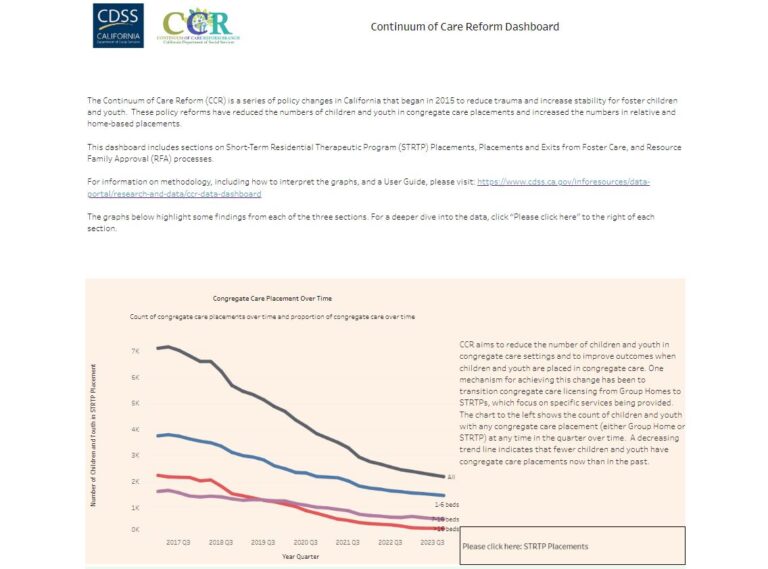 The Continuum of Care Reform (CCR) Dashboard, created by the CA Department of Social Services, is a tool that displays data trends for several CCR indicators. Statewide and county-specific information is available for congregate care, resource families and related services.