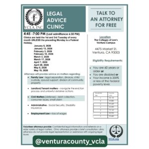 Join us at the Ventura County Legal Advice Clinic on the first and third Tuesdays of the month from 4:45–7 p.m. Volunteer attorneys will provide legal advice to eligible residents on a variety of topics.