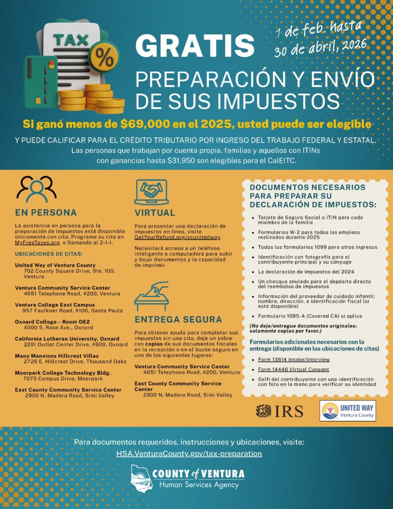 Si ganaste menos de $69,000 en 2025, podrías ser elegible para la preparación y presentación gratuita de impuestos a través del programa VITA. Los trabajadores por cuenta propia, las familias y las personas con ITIN que ganen hasta $31,950 también son elegibles para el Crédito Tributario por Ingreso del Trabajo de California (CalEITC). Las declaraciones de impuestos son preparadas y presentadas por voluntarios capacitados en preparación de impuestos.