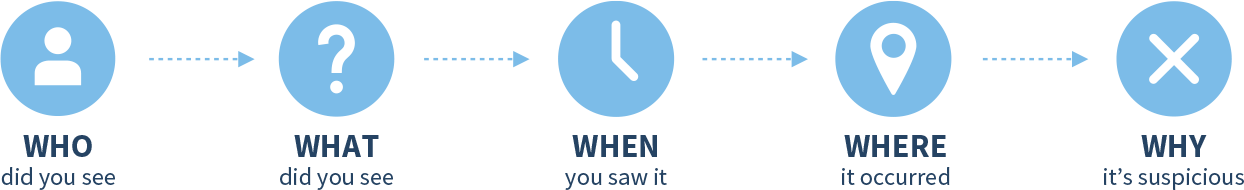 Public safety and security is everyone’s responsibility. If you see suspicious activity, report it to local law enforcement or a person of authority using the “5W’s”: